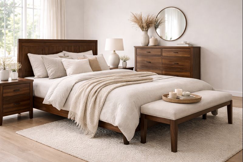 La madera oscura (nogal, roble teñido o cedro) aporta profundidad y elegancia. Al combinarla con telas en colores neutros o claros, se equilibra el peso visual y se evita el efecto de “ambiente cargado”.